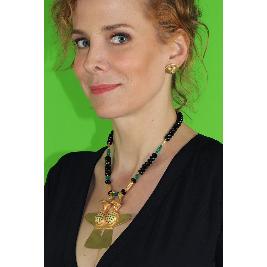 This specific design is very interesting in the meaning “INSEPARABLE” due to the two heads together in one body. Related in our lives to feel that will never take oneself off from. The pectorals of each bird adorned with the emeralds create a refined design. Note that the two bails where the piece hangs are two Birds as well.